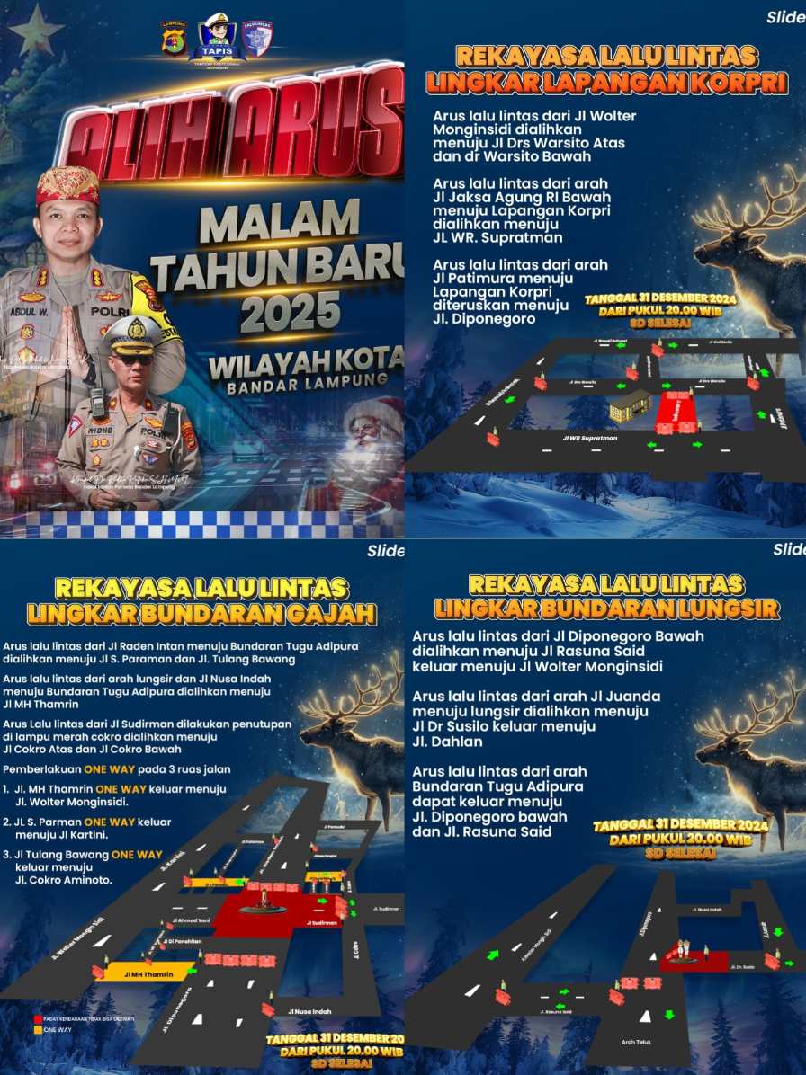 Bandar Lampung – Untuk mengantisipasi lonjakan volume kendaraan pada malam pergantian tahun baru 2025, Polresta Bandar Lampung melalui Satlantas telah menyiapkan rekayasa lalu lintas di beberapa titik strategis.